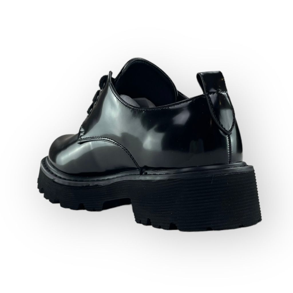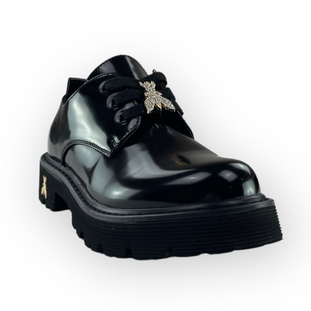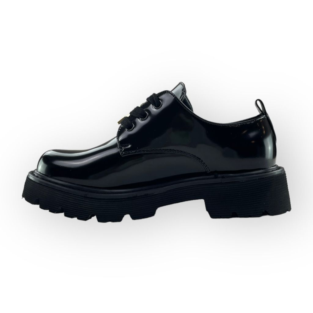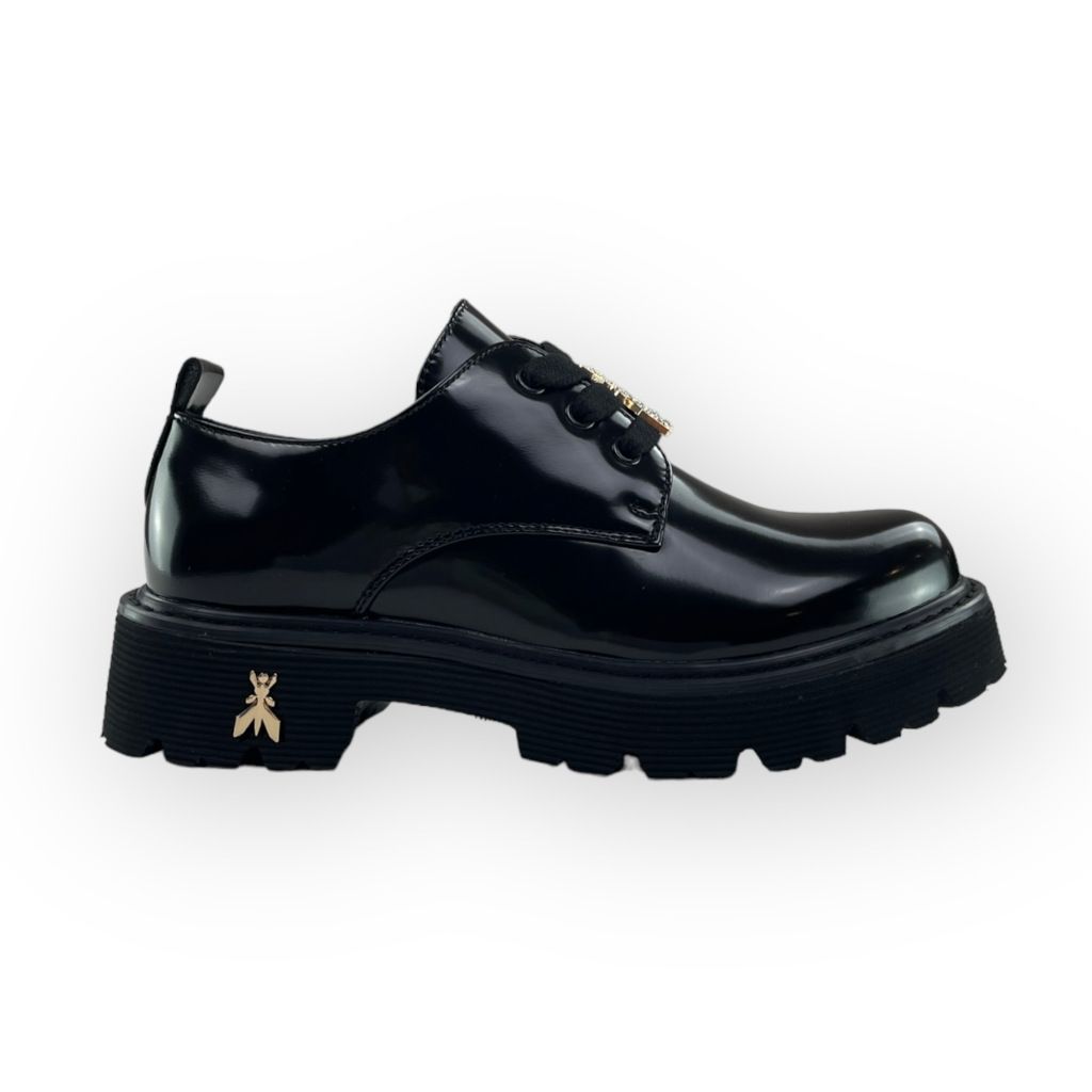 Scarpa nera lucida con lacci della linea Patrizia Pepe.