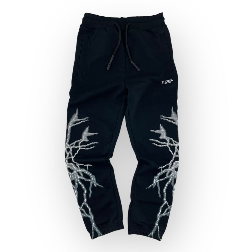 Pantalone in felpa di colore nero con fulmini bianchi da bambino, della linea Phobia.