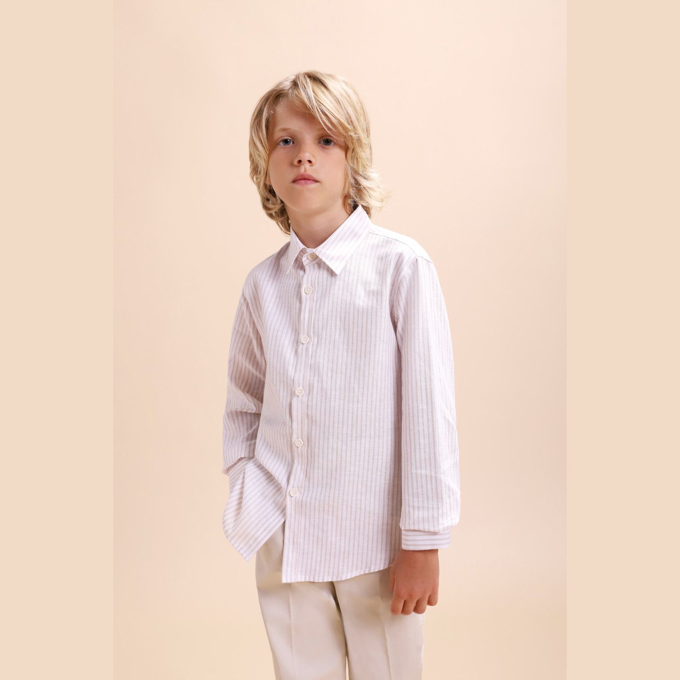 Camicia a righe su base beige da indossare per le occasioni piโ importanti e per gli outfit estivi o primaverili.nnMATERIALE: 55% lino, 45% cotone.