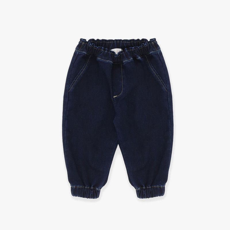 | Info Prodotto | Pantalone in jeans blu denim scuro tutto elasticizzato da bambina della linea Please baby. |