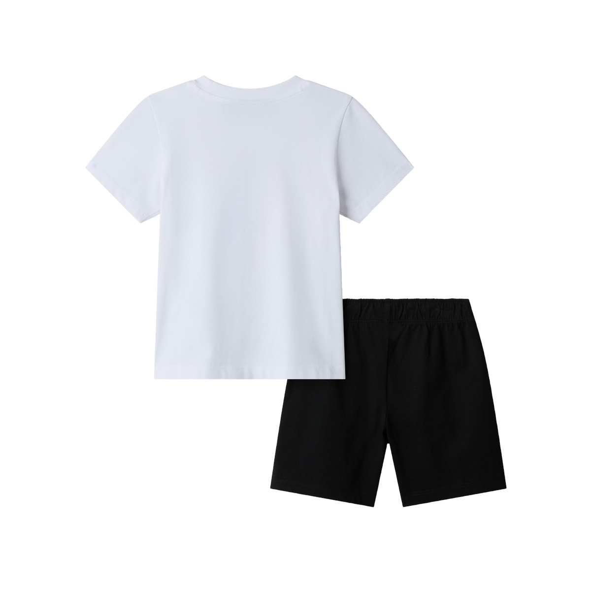 Il design in bianco e nero offre un look moderno e versatile, facilmente abbinabile a qualsiasi outfit. La maglietta è morbida e traspirante, garantendo libertà di movimento, mentre il pantaloncino è comodo e resistente, pensato per accompagnare ogni attività dei bambini senza limitazioni.