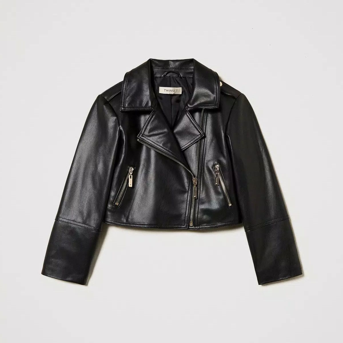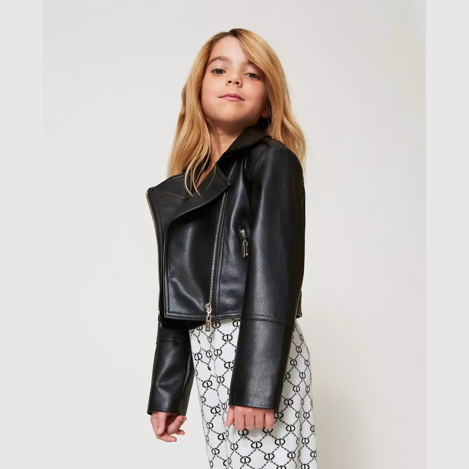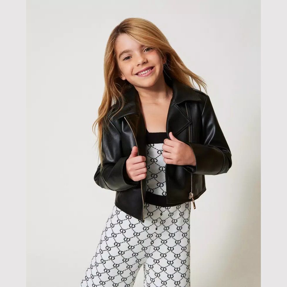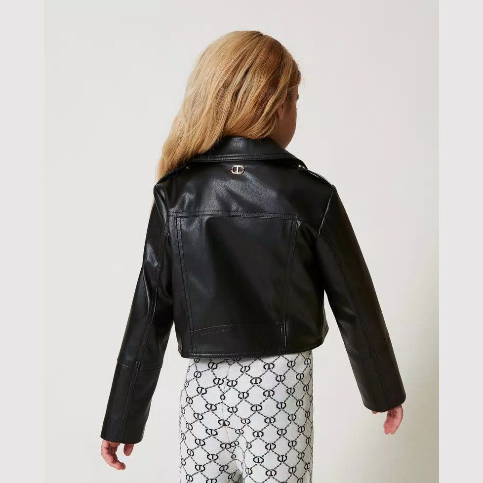 | Info Prodotto | Giacca chiodo in ecopelle nei colori nero e giallo da bambina della linea Twinset. |