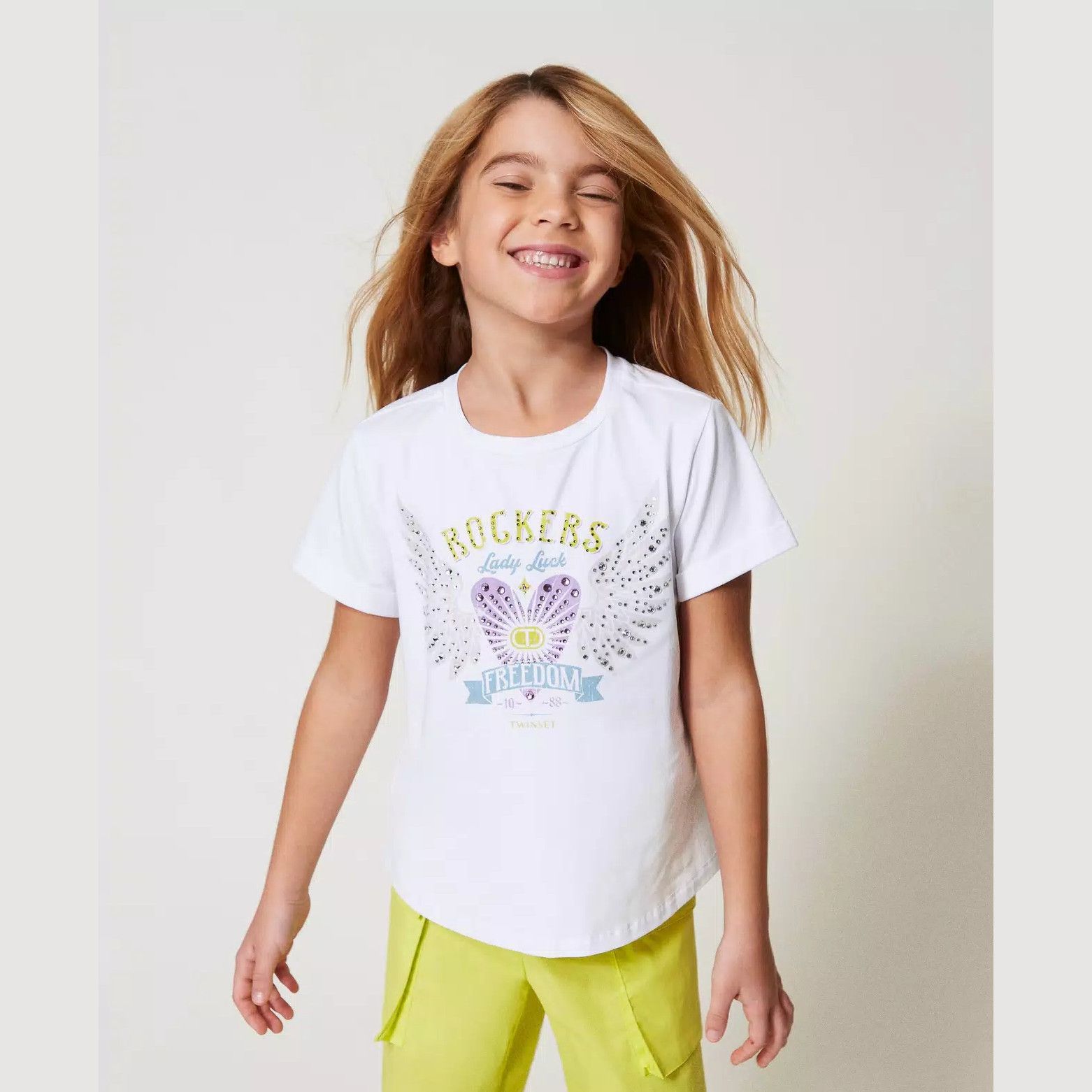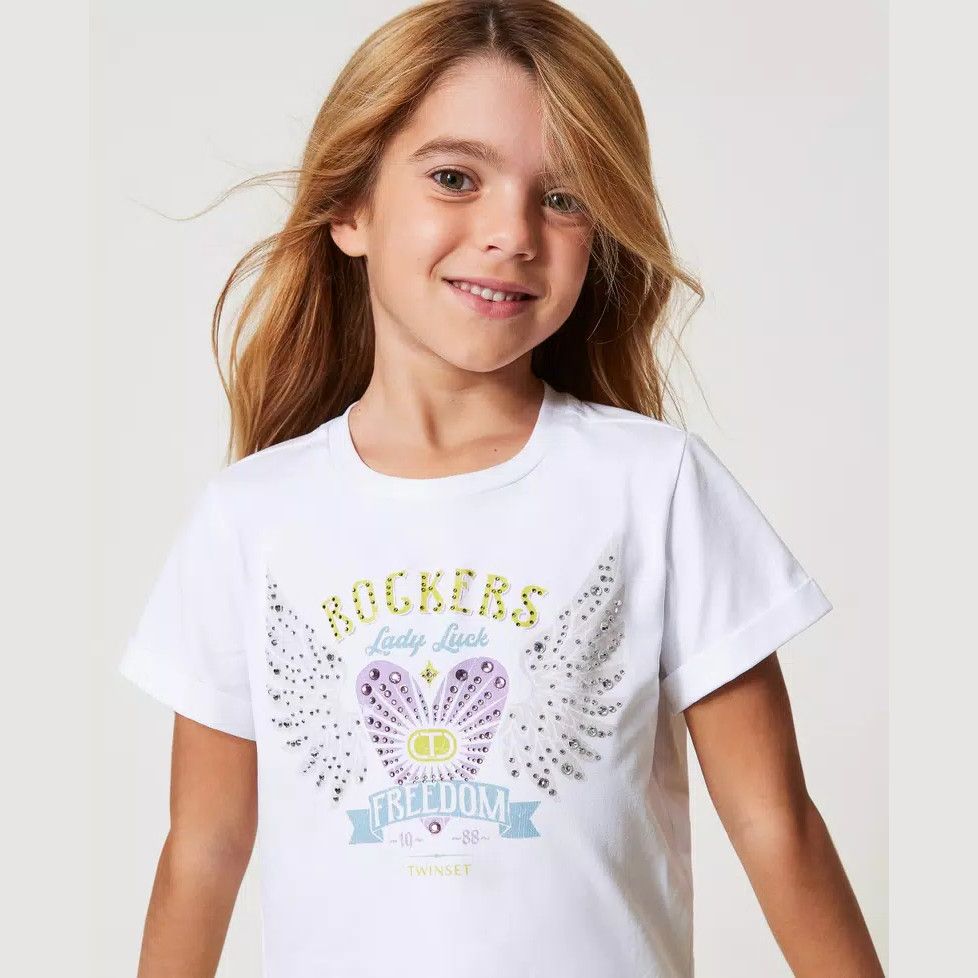 | Info Prodotto | T-shirt mezza manica di colore bianco da bambina della linea Twinset. |