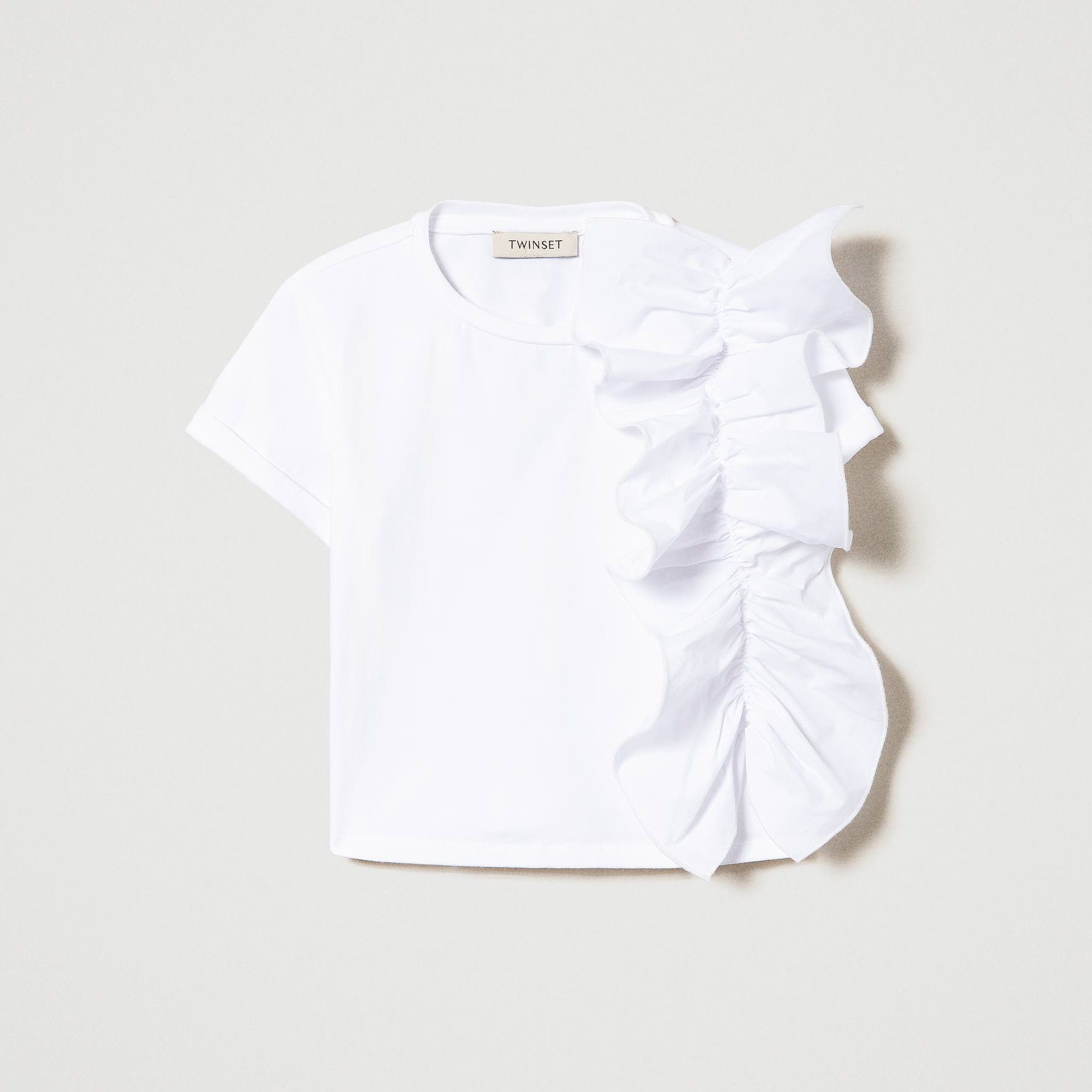 T-shirt mezza manica di colore bianca con rouche da bambina della linea Twinset.